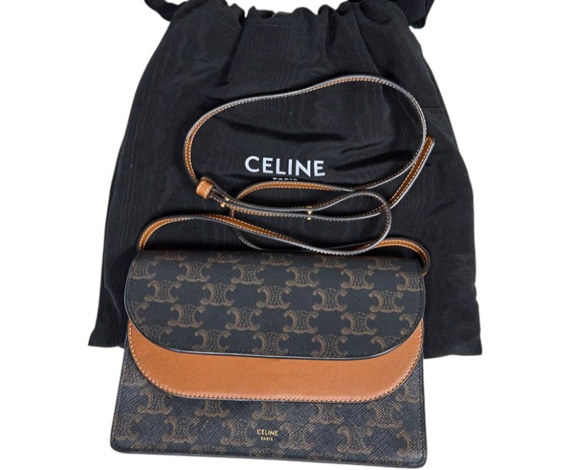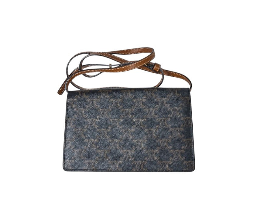 Design:The compact design features the iconic Celine Triomphe logo, a flap closure with a snap button, and an adjustable leather strap for comfortable crossbody wear.
