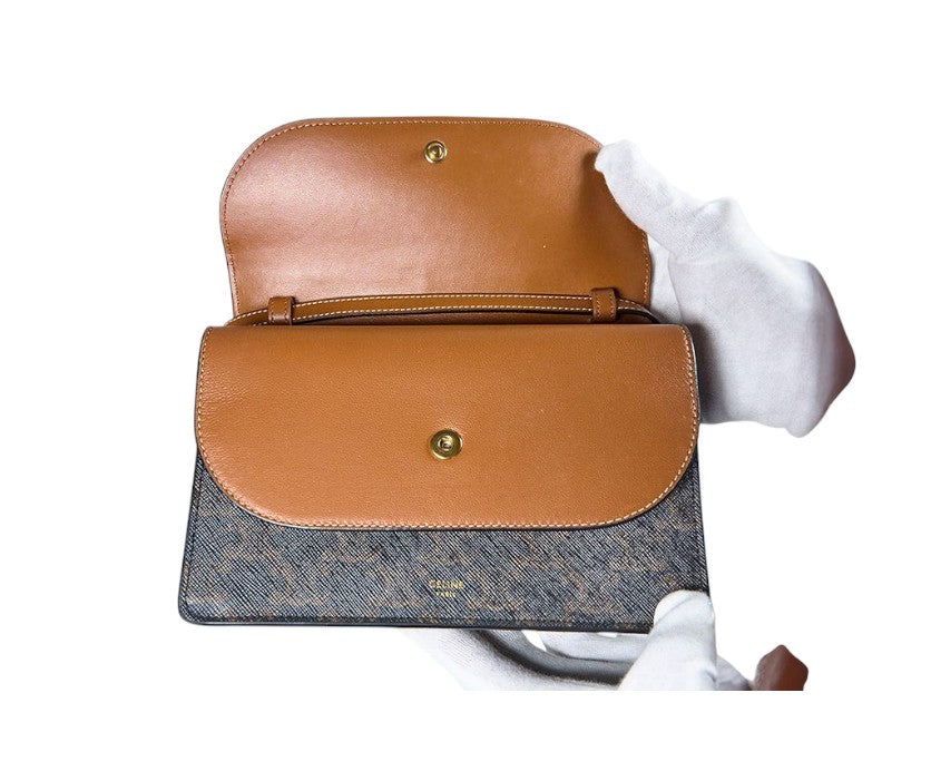 The Celine Wallet on Strap in Triomphe Canvas and Smooth Lambskin is a stylish and functional crossbody bag that combines the convenience of a wallet with the elegance of a designer purse.